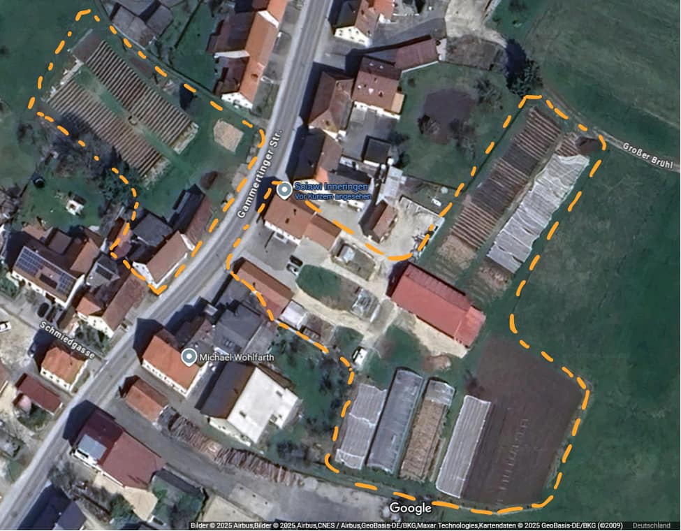 Das Lufbild ist vom März 2025 und entspricht dem aktuellen Stand auf Google Maps. Erkennbar ist die Jahreszeit an den ausliegenden Vliessen, die wir bei den frühen Kulturen für den Kälteschutz verwenden. Auch ist baulich und am Gelände inzwischen wieder einiges passiert: wir freuen uns schon auf das nächste Luftbild, dann in drei Jahren…