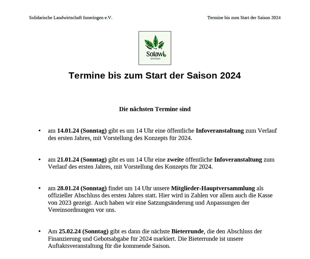 Am 16.02.2025 (Sonntag, um 14 Uhr) ist die Jahreshauptversammlung, die das Ende unseres zweiten Solawi-Jahres markiert. Hier werden die Kasse von 2024 gezeigt, die Finanzplanung von 2025 vorgestellt, und die Details der kommenden Saison präsentiert. Auch wird der Vorstand wieder neu gewählt, beziehungsweise (hoffentlich) bestätigt.