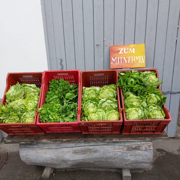 Deswegen gab es diese Woche zum ersten Mal Salat schlichtweg geschenkt: alle Mitglieder und auch alle, die zufällig vorbei kamen, konnten sich so viel Salat aufladen, wie sie wollten. Am Samstag hatten wir immer noch 2 Kisten übrig… und ungefähr 10 Beete, naja. Also so schnell wird es auf jeden Fall noch nicht ausgehen.