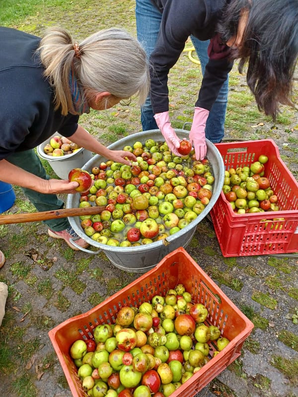 Hier werden gerade die Äpfel gewaschen, bevor sie gehäckselt und dann verpresst wurden.