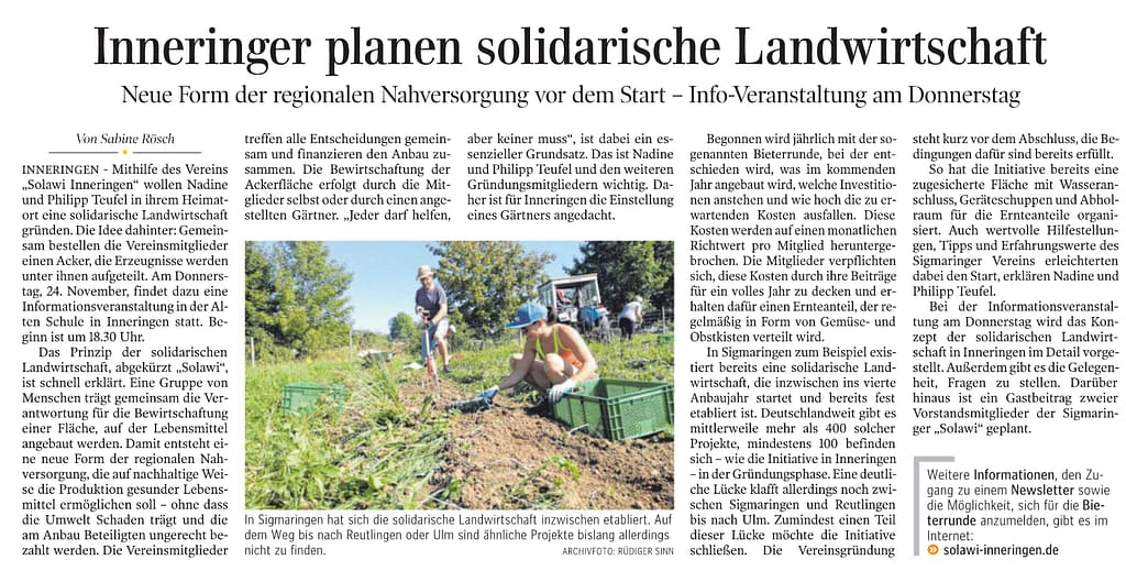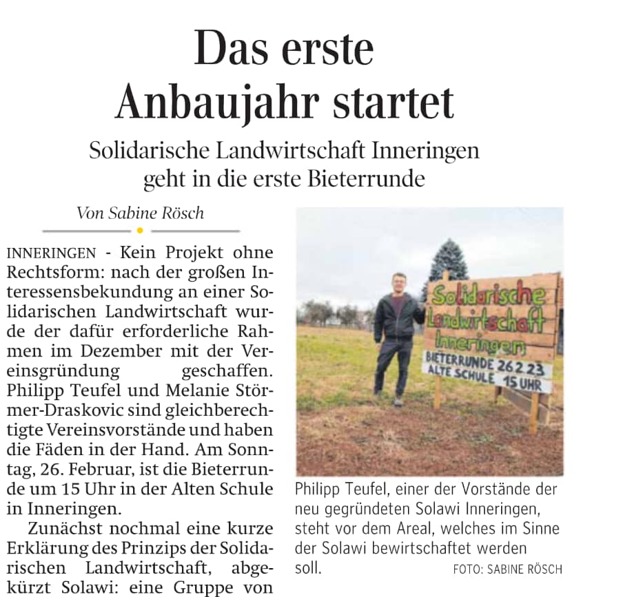 Im April 2023 war Ulrike Mix für den SWR bei uns, beziehungsweise mit uns bei der Solawi in Sigmaringen. Das Interview kann man hier lesen und auch anhören. Wir haben eine PDF-Version hier.